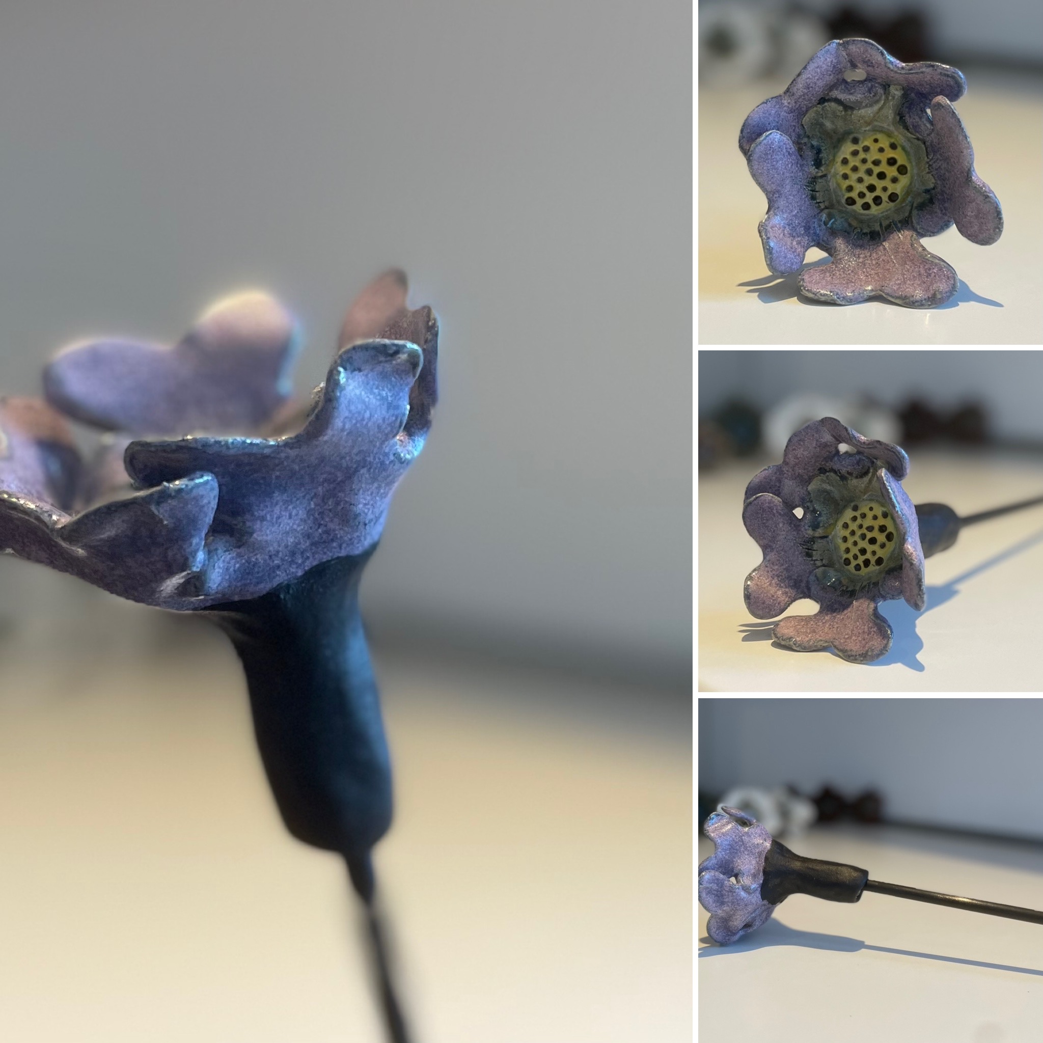 Keramikblomst formet i stentøjsler, glaseret og monteret på genbrugs fiberstænger.