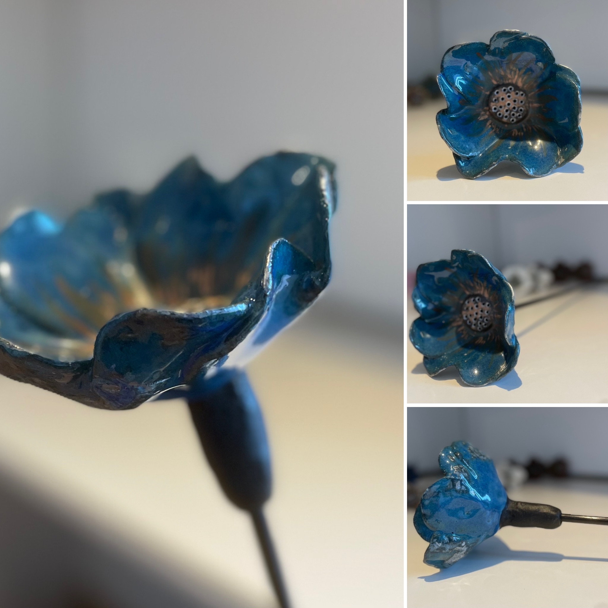 Keramikblomst formet i stentøjsler, glaseret og monteret på genbrugs fiberstænger.