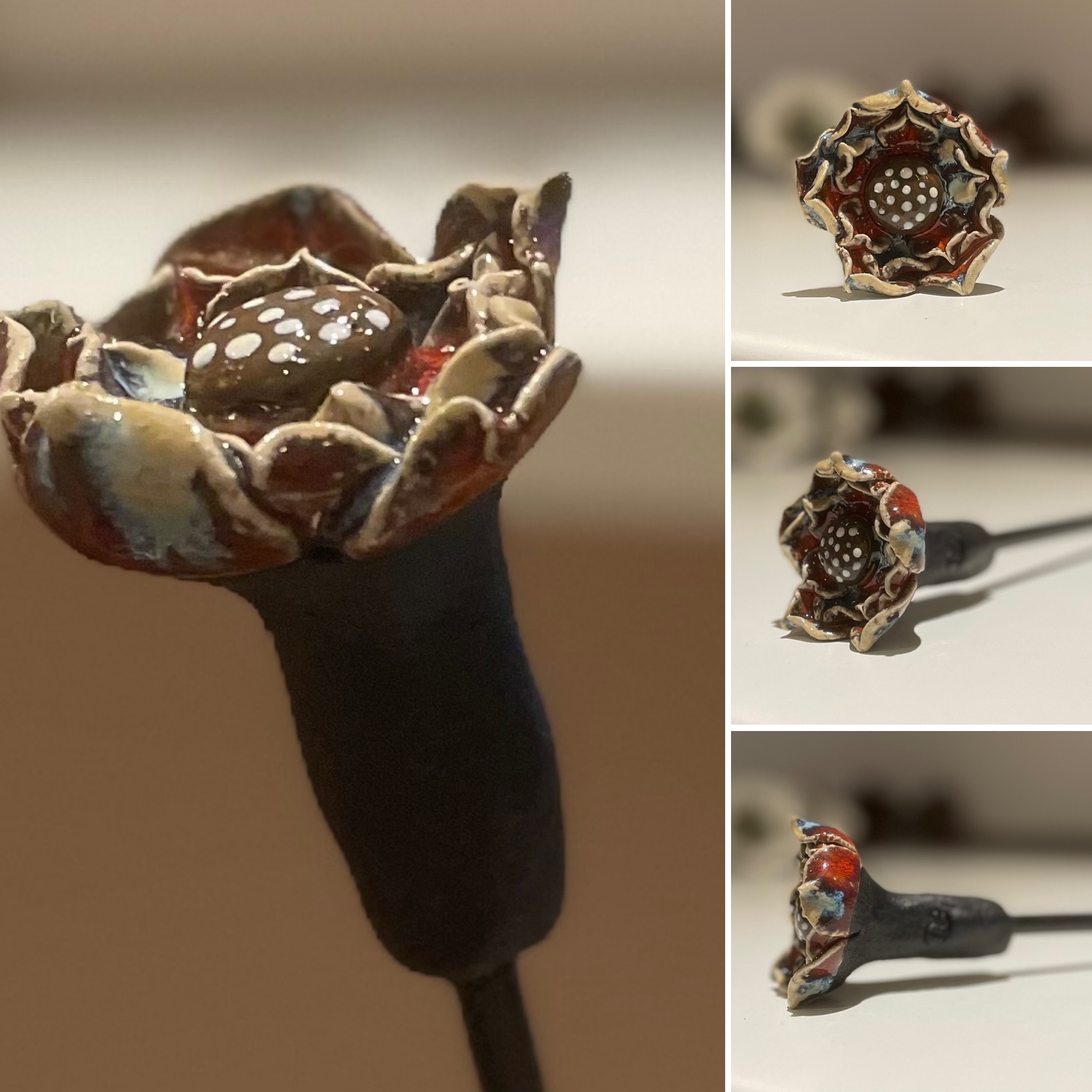 Keramikblomst formet i stentøjsler, glaseret og monteret på genbrugs fiberstænger.