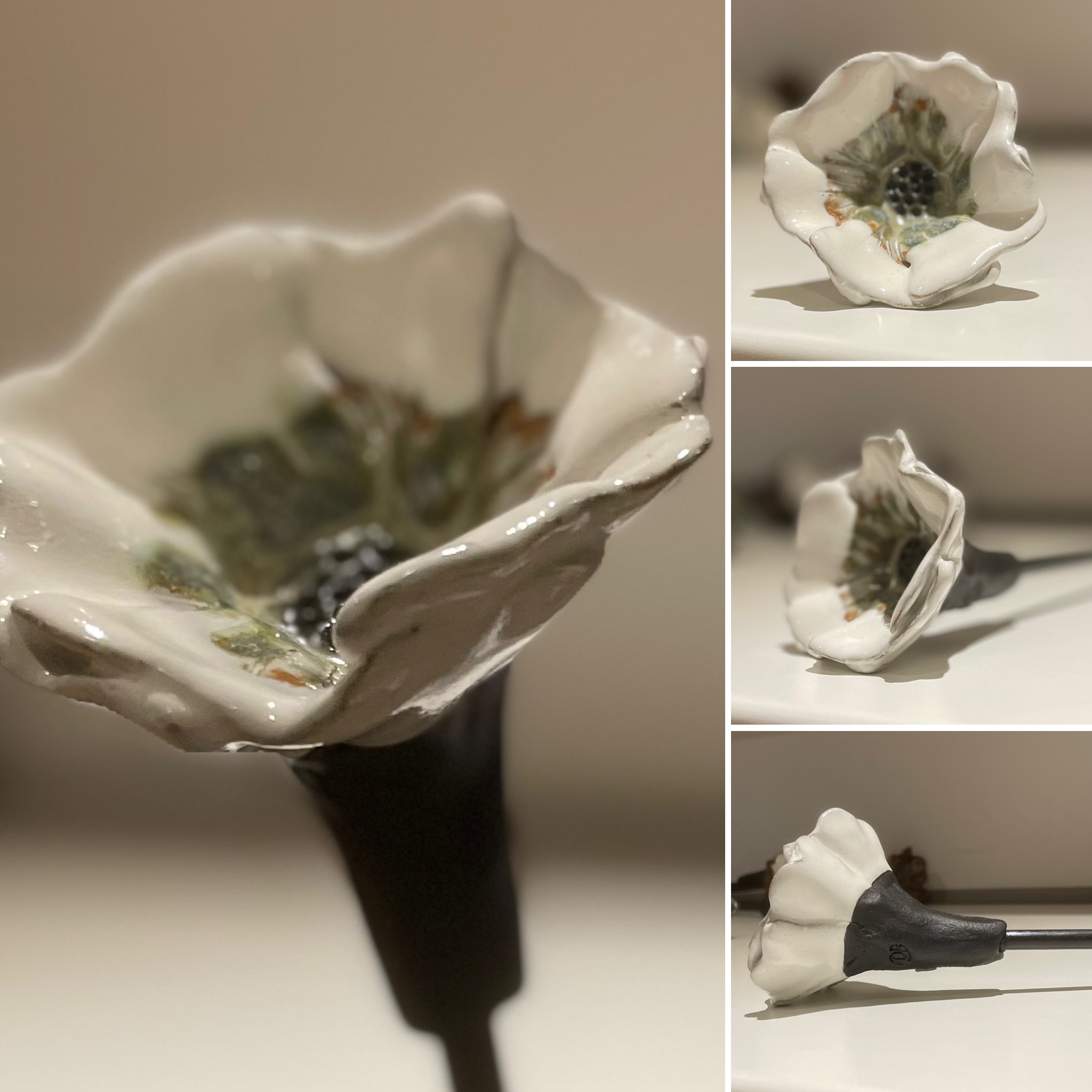 Keramikblomst formet i stentøjsler, glaseret og monteret på genbrugs fiberstænger.
