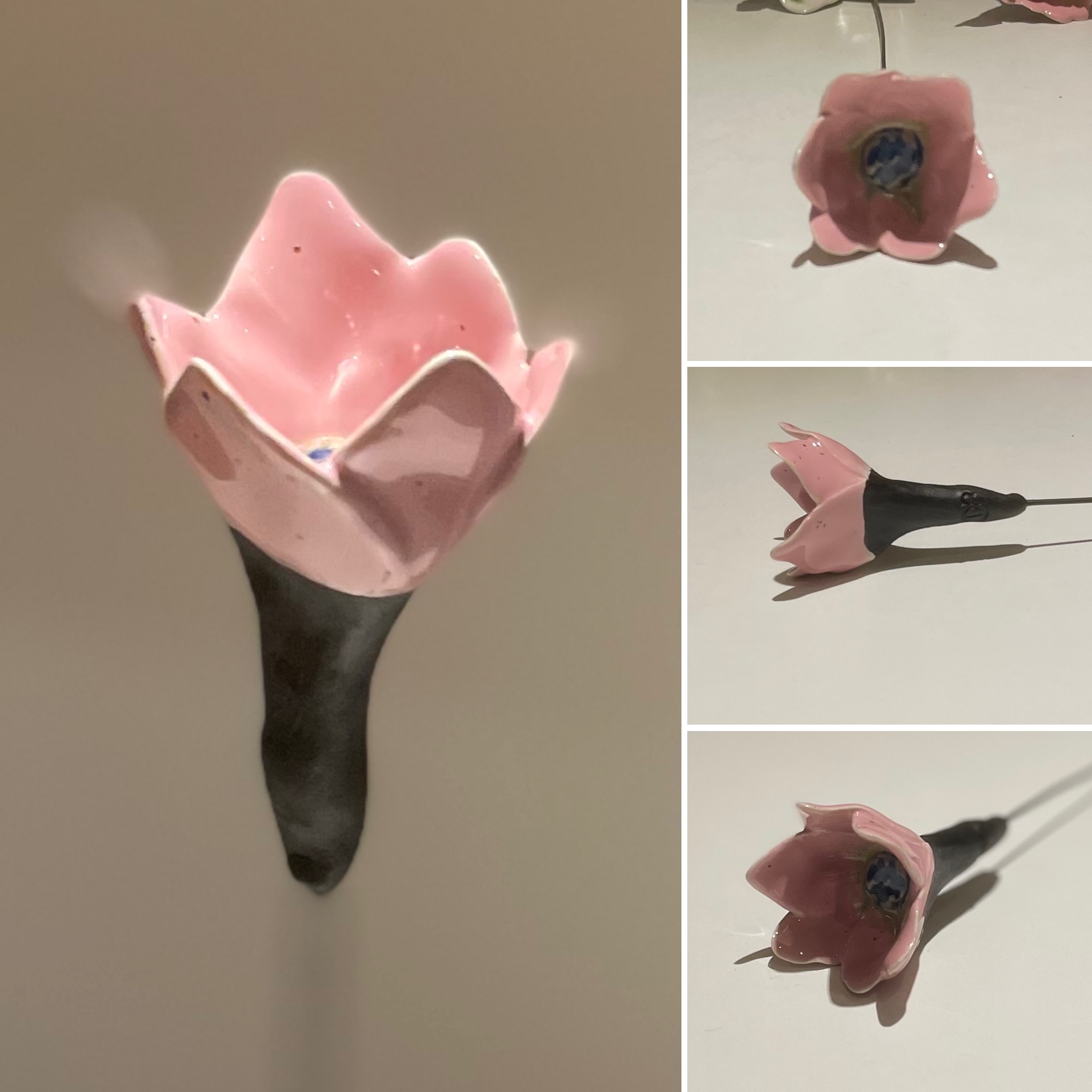 Keramikblomst formet i stentøjsler, glaseret og monteret på elefanttråd.