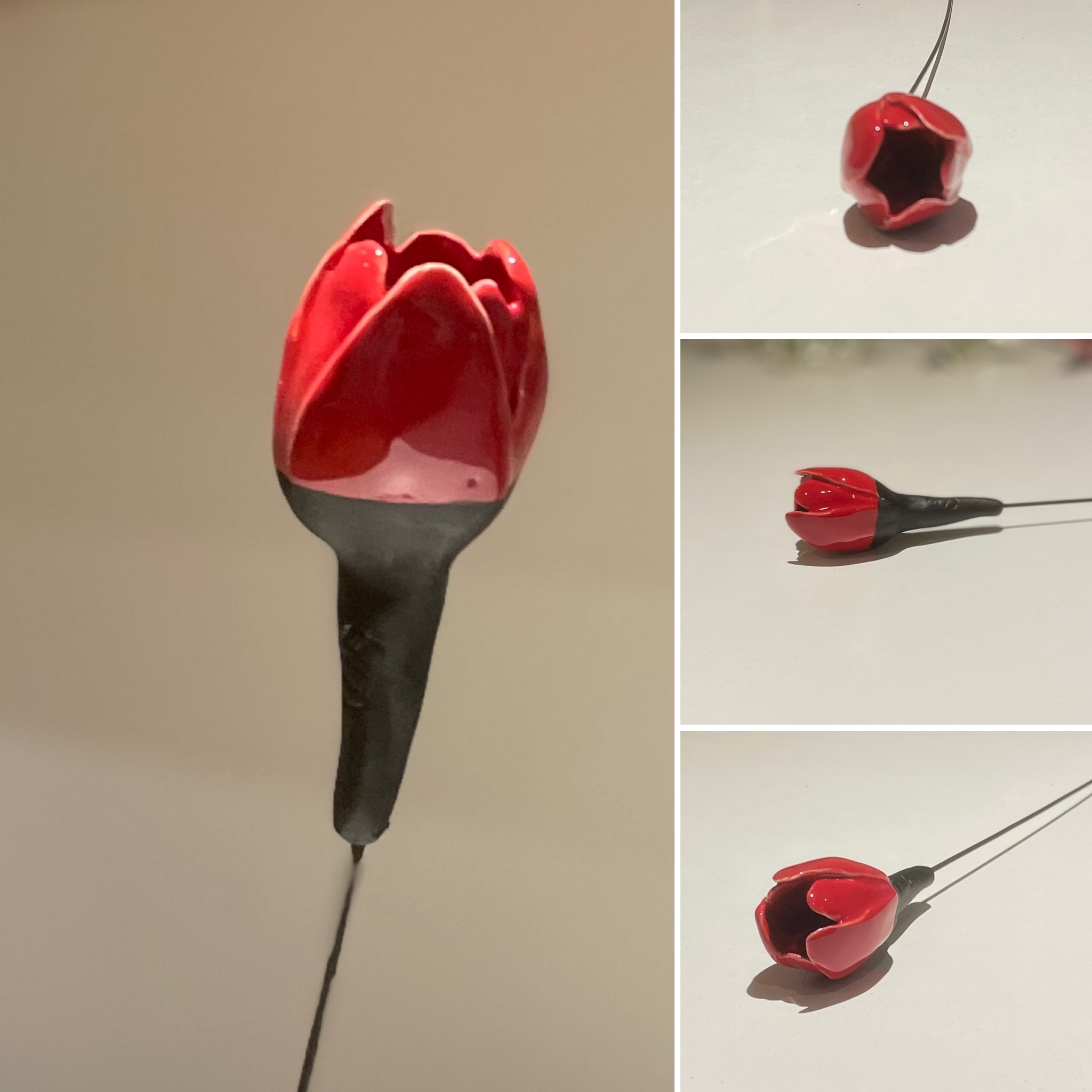 Keramikblomst formet i stentøjsler, glaseret og monteret på elefanttråd.