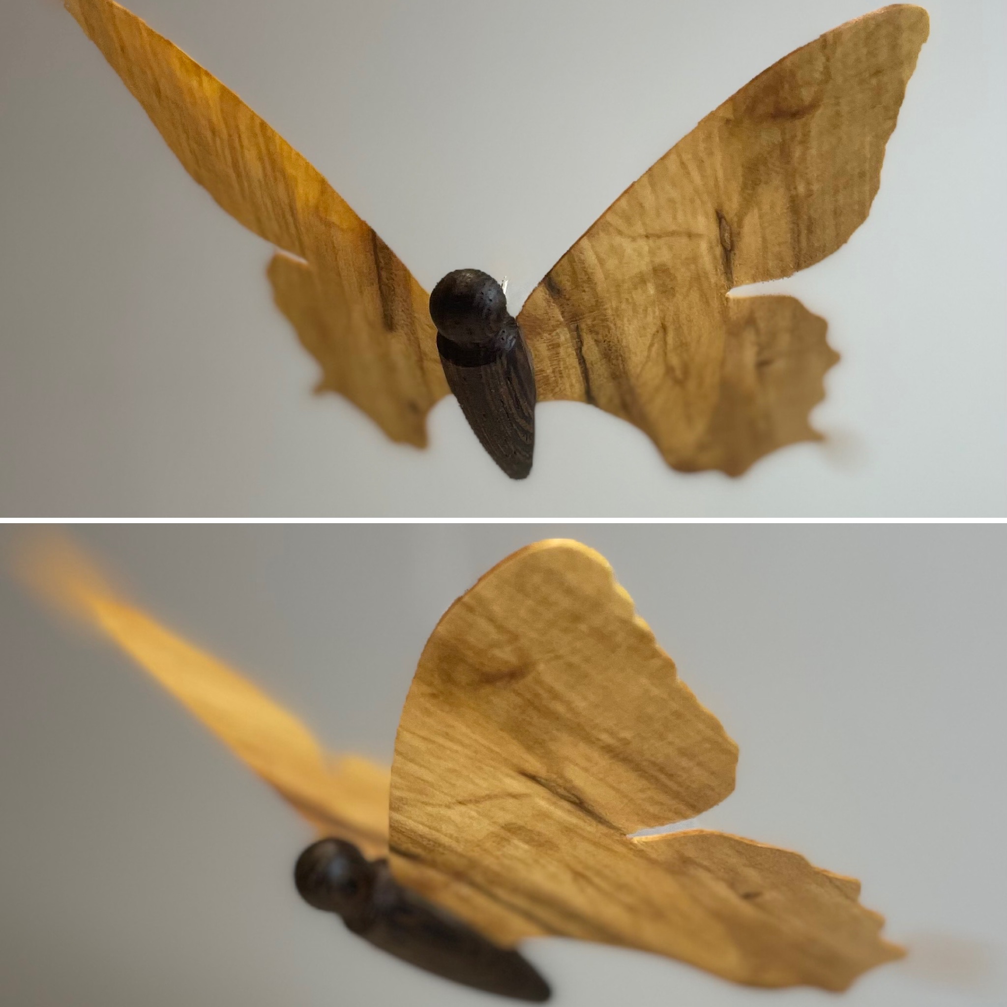 Håndlavet elegant sommerfugl til ophæng, i forskellige træsorter, udført af overskudstræ, monteret med lille sølvtrådsøje.