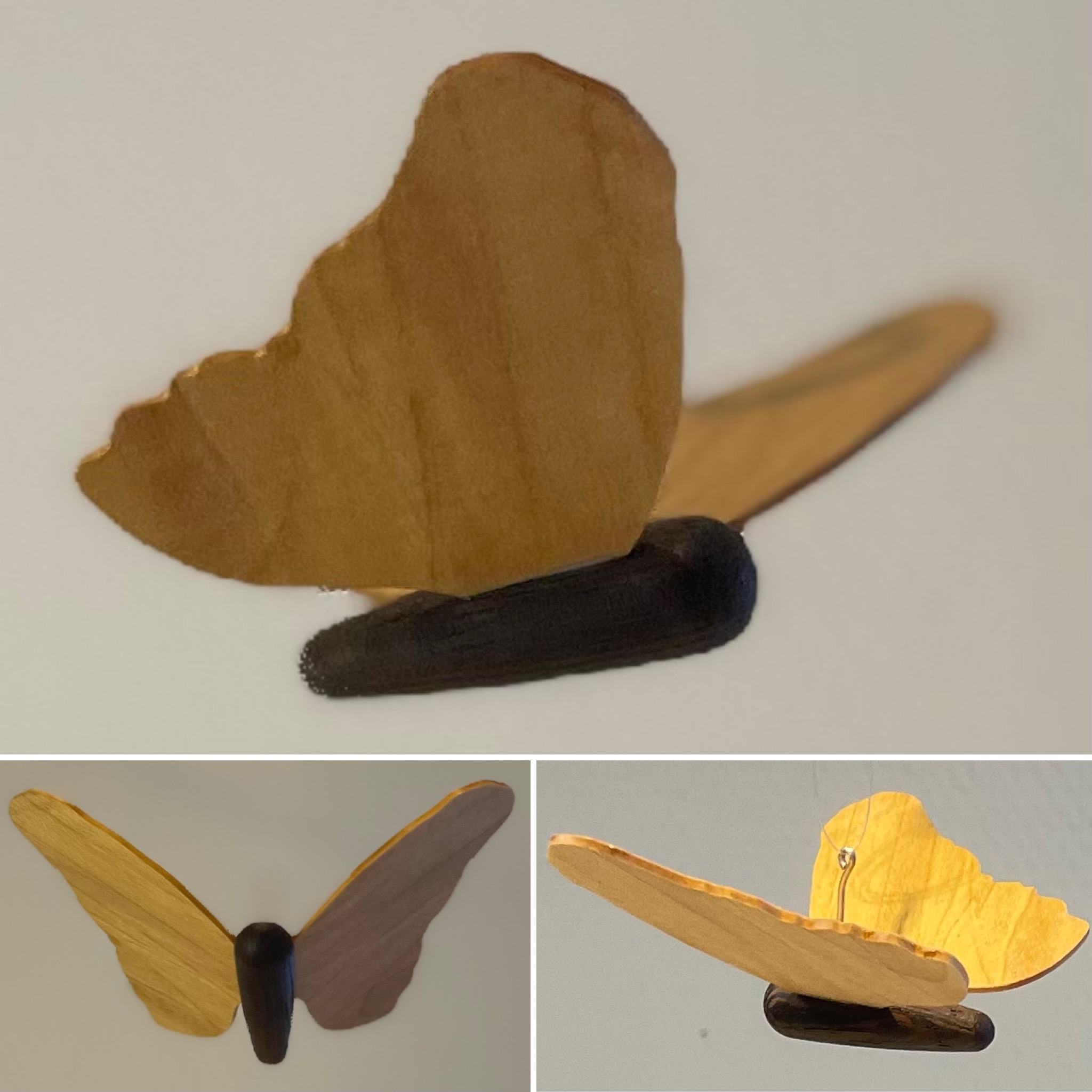 Håndlavet elegant sommerfugl til ophæng, i forskellige træsorter, udført af overskudstræ, monteret med lille sølvtrådsøje.