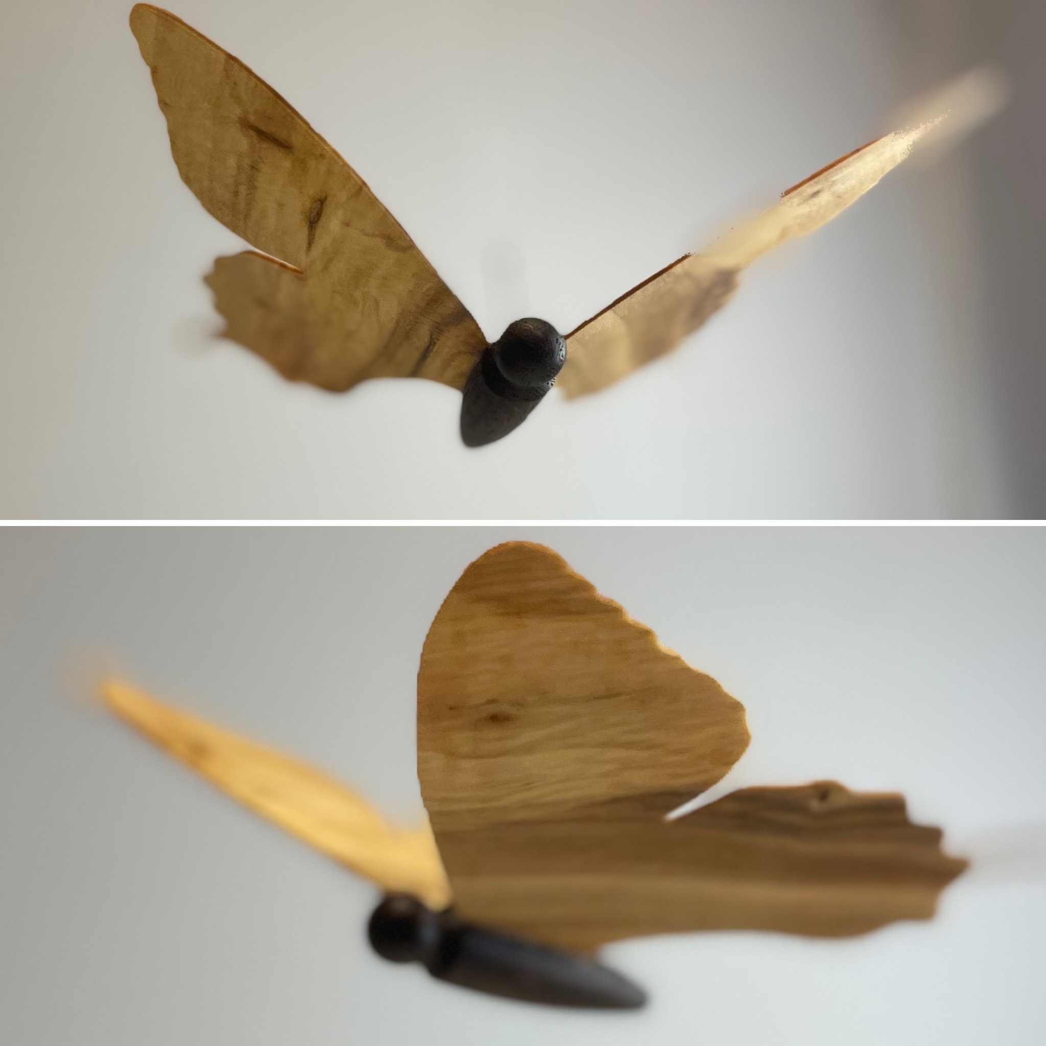 Håndlavet elegant sommerfugl til ophæng, i forskellige træsorter, udført af overskudstræ, monteret med lille sølvtrådsøje.